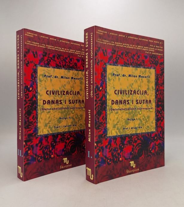 Milan Mesarić: Civilizacija, danas i sutra I-IIOvo je jedinstveno djelo, u dvije knjige, koje na hrvatskom jeziku nema paralele, a teško bismo i u svjetskoj, bilo znanstvenoj bilo popularnoj literaturi naišli na djelo takvih ambicija i takvih opsega. Autor, Milan Mesarić pravi je suvremeni homo universalist, tip renesansnog čovjeka poznavatelja vrlo različitih područja, ali sve ono o čemu piše, poznaje do u detalje zahvaćajući u samu srž problema. U prvom dijelu autor prikazuje metode i filozofiju globalizacije, čiji su pokretači osnovnu pozitivnu ideju izokrenuli u pogubnu praksu koja ozbiljno prijeti uništenjem cjelokupne civilizacije. U drugom dijelu autor izlaže poglede i doktrine suvremenih znanstvenika i filozofa koji govore o mogućnostima drugačijeg, općekorisnog gledanja na svijet, čovječanstvo i pojedinca.Stranica: 454 + 472Dimenzije: 15.5x23.5Jezik: ZagrebPismo: LatinicaStanje: OdličnoUvez: MekiGodina: 2004