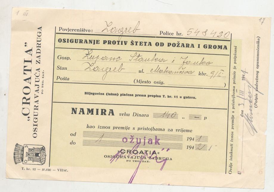 Croatia osiguravajuća zadruga namira 1941_42