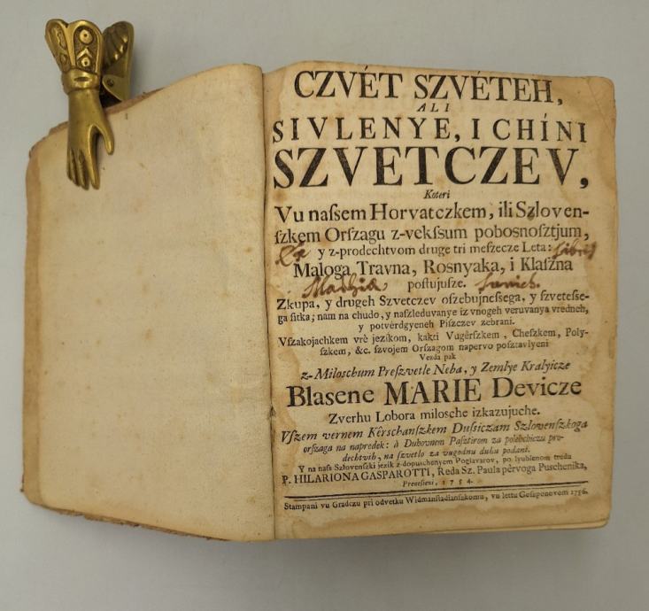 Hilarion Gašparoti: CZVET SZVETEH, ALI SIVLENYE, I CHINI SZVETCZEV... CZVET SZVETEH, ALI SIVLENYE, I CHINI SZVETCZEV, Koteri Vu nafsem Horvatczkem, iliti Szlovenfzkem Orfzagu z-vekfsum pobosnofztjum, y z-prodechtvom druge tri mefzecze Leta: Malog Travna, Rosnyaka, i Klafzna poftujufze.Zkupa, y drugeh Szvetczev ofzebujnefsega, y fzvetefsega fitka; nam na chudo, y nafzleduvanye iz vnogeh veruvanya vredneh, y potverdgyeneh Pifzczev zebrani. Vfzakojachkem vre jezikom, kakti Vugerfzkem, Chefzkem, Polyfzkem, &c. fzvojem Orfzagom napervo pofztavlyeni vezda pak z-Miloscbum Prefzvetle Neba, y Zemlye Kralyicze Blasene MARIE Devicze Zverhu Lobora milosche izkazujuche.Stampani vu Gradczu, leto 1756.Ovo je izuzetno rijetka knjiga, poznato je samo nekoliko primjeraka koji se nalaze u hrvatskim knjižnicama.HILARION GAŠPAROTI, pavlin propovjednik i pisac ( Samobor 1714.- Lepoglava 1762.). Pisao je propovjedi i hagiografska djela. Gašparotijeva knjiga Czvet Szveteh je pravo enciklopedijsko djelo hrvatsko-kajkavske književnosti 18. st. ne samo po svom opsegu ( 4 sveska sa ukupno 3761 str.), nego primarno po svom istraživačkom usmjerenju prema proučavanju brojnih književnih i povijesnih izvora koji su poslužili u stvaranju te najveće hrvatske hagiografske antologije. Svaki opsežan svezak Gašparoti je posvetio jednom Bogorodičnom kipu zagorskih svetišta tj. kipu iz Bistrice, Lobora, Veternice i Očure uz popratne bakroreze s reprodukcijama navedenih kipova. Početak svakog sveska započinje posvetom ili biranim uvodnim riječima na čast pojedinog kipa u kojem se veliča Bogorodica. Posvetom cjelokupnog djela Bogorodice Gašparoti je potvrdio bogato razvijeni barokni Marijanski kult na kajkavskom književnom jeziku.Predmetni primjerak je posvećen Majci Božjoj iz Lobora.Nedostaje bakropis Majke Božje Loborske.Stranica: 924Dimenzije: 17x20.5Jezik: AustrijaPismo: LatinicaStanje: DobroUvez: TvrdiGodina: 1756