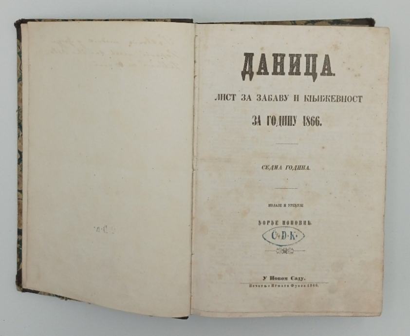 Danica 1866.Danica. List za zabavu i književnost za godinu 1866.Sedma godinaIzdaje i ureðuje: Ðorðe PopovićPredmetni primjerak je poklon urednika Ðorðe Popovića Oskaru Jelačiću. Stranica: 860Dimenzije: 17x23.5Jezik: Novi SadPismo: ĆirilicaStanje: DobroUvez: TvrdiGodina: 1866