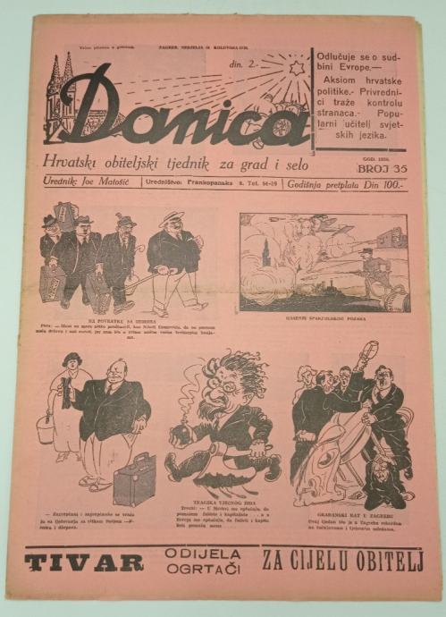 Danica br. 35/1936.Urednik: Joe MatošićStranica: 10Dimenzije: 29.5x42.5Jezik: ZagrebPismo: LatinicaStanje: Vrlo dobroUvez: MekiGodina: 1936