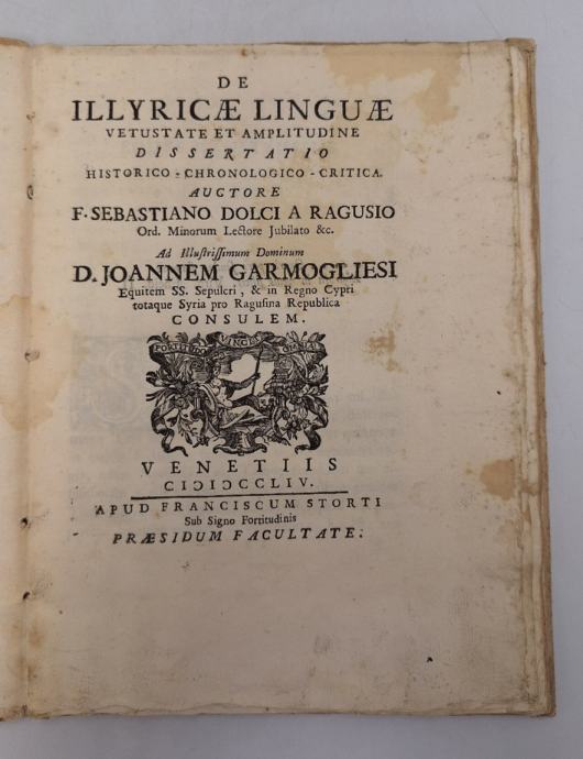 Sebastijan Slade Dolci: De Illyricae linguae vetustate et amplitudine Dissertatio historico-chronologico-critica. Auctore f. Sebastiano Dolci a Ragusio ... Ad ... dominum d. Joannem Garmogliesi ...Uz to privezano: Epistola Hieronymi Francisci Zanettii in Dissertationem de linguae Illyricae vetustate et amplitudine confutata perpetuis animadversionibus in ejusdemZanetti disquisitionem de caussis sero corruptae eloquentiae apud veteres jureconsultos, seriusque apud recentiores restitute, auctore p. f. Sebastiano Dolci a RagusioSlade Dolci Sebastijan (Sebastianus Dolci), hrvatski teolog, crkveni povjesničar i nabožni pisac (Dubrovnik, 1699 – Dubrovnik, 1. VI. 1777). Glavni propovjednik u dubrovačkih franjevaca, proslavio se korizmenim propovijedima u talijanskim gradovima. Napisao je Povijesne zapise o Dubrovačkoj franjevačkoj provinciji (Monumenti storici della provincia Francescana di Ragusa, 1744), Protukritičko pismo o starosti Dubrovačke biskupije (De Ragusini archiepiscopatus antiquitate epistola anticritica, 1761), biografiju sv. Jeronima (Maximus Hieronymus, 1750), raspravu o postanju slavenskih jezika, napose hrvatskoga (O starosti i raširenosti ilirskoga jezika – De Illyricae linguae vetustate et amplitudine, 1754). Za književnu povijest najvažnija je njegova Dubrovačka književna kronika ili Pregled književnika koji su se proslavili u Dubrovačkoj Republici do 1766. godine (Fasti litterario-Ragusini sive virorum litteratorum Qui usque ad annum MDCCLXVI in Ragusina claruerunt Ditione, 1767), u kojoj je predstavio 271 dubrovačkoga pisca. Stranica: 64Dimenzije: 19x25Jezik: VenecijaPismo: LatinicaStanje: DobroUvez: MekiGodina: 1754