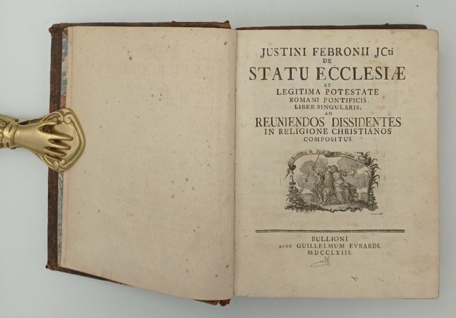 Johann Nicolas Hontheim: De statu EcclesiaeHONTHEIM JE PISAO POD PSEUDONIMOM FEBRONIUS. ARGUMENTIRANA KRITIKA PAPINSKOG APSOLUTIZMA.Stranica: 713Dimenzije: 18x22Jezik: BelgijaPismo: LatinicaStanje: Vrlo dobroUvez: TvrdiGodina: 1763