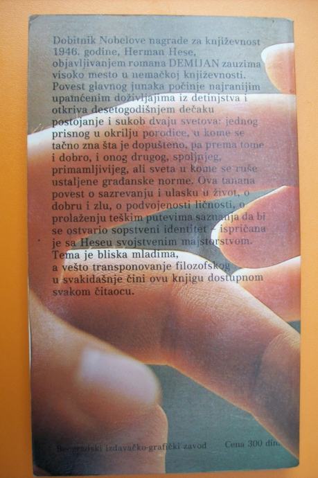 Povijest glavnog junaka počinje najranijim upamćenim doživljajima iz djetinjstva i otkriva desetogodišnjem dječaku postojanje i sukob dvaju svjetova: jednog prisnog u okrilju obitelji, u kome se točno zna što je dopušteno, pa prema tome i dobro, moralno i prihvatljivo, i onog drugog, vanjskog, primamljivog, ali svijeta u kojem se ruše ustaljene građanske norme. Ova tanana pripovijest o sazrijevanju i ulasku u život, o dobru i zlu, o podvojenosti ličnosti, o prolaženju teškim putovima saznanja da bi se ostvario vlastiti identitet - ispričana je s Hesseu svojstvenim majstorstvom. Tema je bliska mladima, a vješto transponiranje filozofskog u svakidašnje čini ovu knjigu dostupnom svakom čitatelju."
