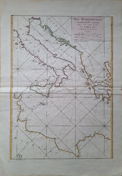 Depot de la Marine (J. Bellin): Mer Mediterranee Seconde Feuille contenant L'Italie, Sicile, Golphe de Venise, Costes de Dalmatie, Albanie, et Partie de celles de Barbarie.Srednji list pomorskog zemljovida Sredozemlja, koji prikazuje Jadransko more i cijelu hrvatsku obalu u imperijalnom folio formatu. Bakrorez, boja, široke margine i izvrsno stanje. Fino gravirana karta Italije i središnjeg dijela Mediterana, koju je objavio Depot de la Marine.Kartu je pod vodstvom Dépôt des cartes et plans de la Marine tiskao Jacques-Nicolas Bellin.Jacques-Nicolas Bellin (1703-1772) bio je jedan od najvažnijih kartografa osamnaestog stoljeća. Godine 1721., sa samo 18 godina, postavljen je za hidrografa francuske mornarice. U kolovozu 1741. postao je prvi Ingénieur de la Marine Dépôt des cartes et plans de la Marine (Francuski hidrografski ured) i imenovan je službenim hidrografom francuskog kralja.Dimenzije: 58.5x81Jezik: FrancuskaPismo: LatinicaStanje: OdličnoUvez: MekiGodina: 1745