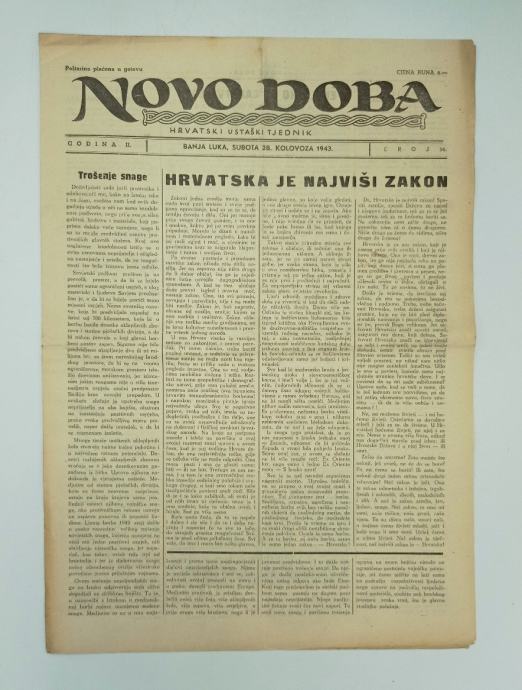 Novo doba br. 34/1943.Hrvatski ustaški tjednikGlavni i odgovorni urednik: Miroslav ŠajatovićStranica: 8Dimenzije: 30.5x43Jezik: Banja LukaPismo: LatinicaStanje: DobroUvez: MekiGodina: 1943