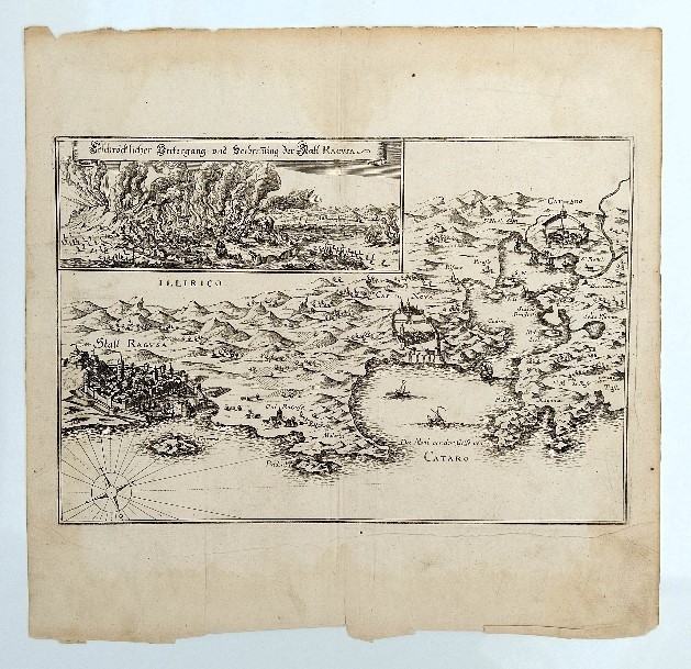 Matthaus Merian: Dubrovačko zaleđe (Erschöcklicher Untergang und Verbrenung der Statt Ragusa)BakrorezNajveća pažnja data je prikazu samog Dubrovnika u kojem jasno raspoznajemo njegove kule i katedralu. Istočno od Dubrovnika vidimo Cavrat te čitav Bokokotorski zaljev s prikazom Novog i Kotora. U gornjem lijevom uglu karte nalazi se zasebna veduta Dubrovnika. Prikaz je to velikog potresa koji je zadesio Dubrovnik 1667. godine. Slika Dubrovnika prikazanog u požaru nije sasvim realan. Ova Merianova veduta objavljena je 1690. godine u djelu L. Gottfriedta “Archeontologija Cosmica”. Matthaus Merian (1593 - 1650) Topograf, bakrorezac i nakladnik (1593 - 1650). Studirao je u Zurichu, a radio u Frankfurtu na Maini. Najpoznatije njegovo djelo sustavna je zbirka planova i panorama gradova pod nazivom Theatri Europei Oder Historische Beschrei Vornemdsten und denckwurdigsten Geschichten, so sich hin weider in Europa sonderlich im Reic Nation von Anno 1642 bis Anno 1647. U razdoblju od 1629. do 1718. to je djelo doživjelo više izdanja. Archeologica Cosmica njegovo je djelo koje je također doživjelo više izdanja u razdoblju od 1638. do 1649. Poznat je i po svojoj Topographia Provinciarum Austriacarum objavljenoj 1649. u Frankfurtu na Maini. Bio je vrlo cijenjen graver i izdavač velikog broja različitih knjiga i tiskovina. Autor je predivnih opisa biljaka i cvijeća koje koriste u medicini objavljenih u knjizi Die fruchbringede Gesellschaft 1646. godine u Frankfurtu na Maini. Theatri Europei sadrži i karte hrvatskih područja, npr. vedutu Senja, kartu okolice Klisa i Splita ili kartu zadarsko - šibenskog zaleđa. Posljednju kartu izradio je u koautorstvu s Natalom Bonifacijom, a jedan njezin primjerak čuva se u Sveučilišnoj knjižnici u Splitu. Pored nje tamo se može naći i njegova karta Ragvsa.Stranica: -Dimenzije: 35x34Jezik: FrankfurtPismo: LatinicaStanje: OdličnoGodina: 1680