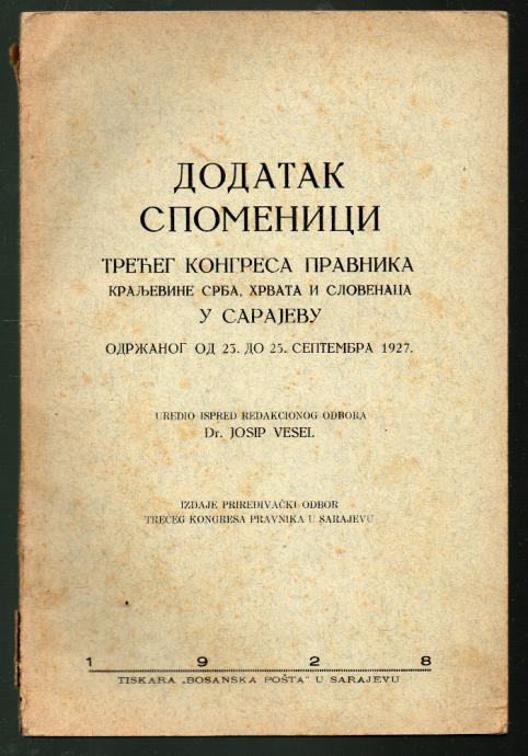 Dodatak spomenici Trećeg kongresa pravnika Kraljevine Srba, Hrvata i Slovenaca u Sarajevu održanog od 23. do 25. septembra 1927.