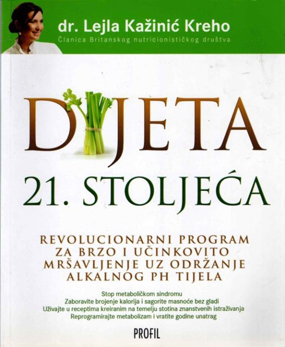 Dijeta 21. stoljećaInzulinska neosjetljivost, višak tjelesne težine, izražena abdominalna mast, povišene vrijednosti krvnih masnoća i krvni tlak, kronični umor, depresija, razdražljivost, ubrzano starenje ― sve zajedno čini metabolički sindrom ili sindrom X, koji se zbog nepravilne prehrane u zapadnoj civilizaciji širi poput zaraze. Nutritivna terapija jedino je znanstveno dokazano sredstvo koje suzbija metabolički sindrom jer omogućuje brz gubitak kilograma i smanjenje rizika od potencijalno smrtonosnih krvožilnih bolesti.U knjizi “Dijeta 21. stoljeća” dr. Lejla Kažinić Kreho predstavlja vlastiti redukcijski program koji metabolizam vraća u normalu. Kombinacija bjelančevina i alkalnog povrća te začina bogatih antioksidansima, omogućuje brz gubitak kilograma, uz uživanje u hrani i njezinoj pripremi.“Dijeta 21. stoljeća” je brz, učinkovit i agresivan program. Temelji se na kvalitetnim bjelančevinama iz mesa i mliječnih proizvoda, obilju alkalnog povrća, sa zanimljivim snackom od badema, štapića celera i raznih umaka. Iako nudi užitak u raznovrsnoj hrani i ne traži odricanje, “Dijeta 21. stoljeća” ne predviđa ništa slatko, pa čak niti voće.Obilje voća i povrća, međutim, nudi mediteranska dijeta, u kojoj se može uživati nakon što se tijelo uravnoteži i vrati mladenački izgled.Stranica: 136Dimenzije: 23X19Jezik: ZagrebPismo: LatinicaStanje: Nova knjigaUvez: MekiGodina: 2013