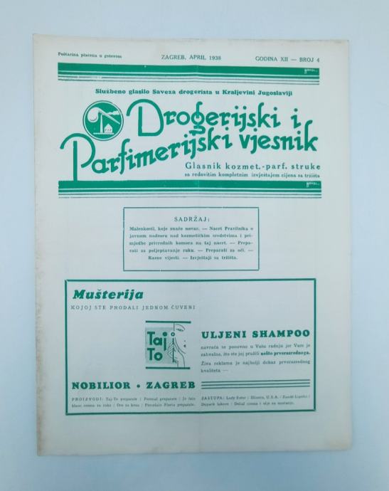 Drogerijski i parfimerijski vjesnik br. 4/1938Urednik: Miroslav SeverGlasnik kozmet.-parf- struke sa redovitim kompletnim izvještajem cjena sa tržištaStručni list za droge, pharmaceutske poizvode, parfimeriju, sapun, gumenu i zavojnu robu, lak i boje kao i za industriju četaka te cjelokupnu kemijsku industrijuStranica: 22Dimenzije: 24x31Jezik: ZagrebPismo: LatinicaStanje: DobroUvez: MekiGodina: 1938