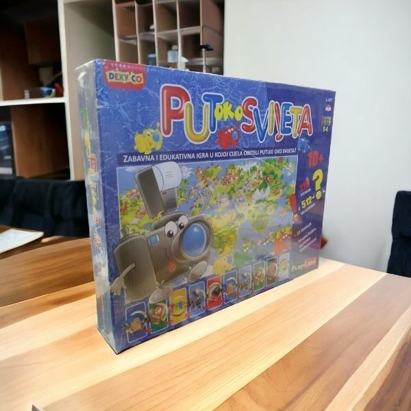 Pobjegnite od svakodnevne rutine i uživajte u ovoj igri! Put oko svijeta je zanimljiva edukativna igra za cijelu porodicu. Sa željom da pobijedi, igrač kreće na virtualno putovanje i usput dobija zanimljive informacije i prikuplja znanje o najrazličitijim zemljama. Igra je izuzetno primamljiva za sve uzraste jer sadrži 20 različitih destinacija, 20 različitih izleta, znamenitosti i iznenađenja, kao i 132 pitanja i 528 odgovora. Igra je namijenjena za 2-4 igrača. Preporučena dob: 8 ili više godina Jezik: ZAGREBPismo: LatinicaStanje: NOVOUvez: Kutija