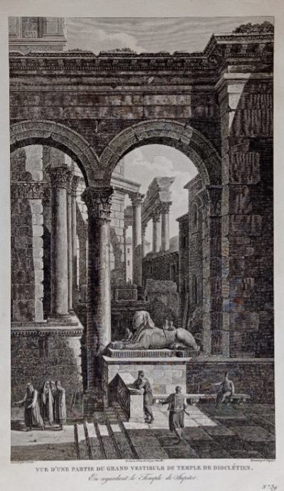 Louis-Francois Cassas i Joseph Lavallée: Egipatska (mitološka) neman (sphynx) u istočnjačkom granitu / Vue d'une partie du grand vestibule du Temple de Diokletien. En regardant le Temple de JupiterEgipatska (mitološka) neman (sphynx) u istočnjačkom granitu: Sprijeda se vidi velika egipatska (mitološka) neman (sphynx) u istočnjačkom granitu, koju je Dioklecijan vjerojatno dao donijeti iz Egipta ili Rima za poljepšavanje palače.Veduta iz monumentalnog djela „Voyage pittoresque dell'Istrie et de la Dalmatie“, Pariz, 1802.Bakrorez, uže margineDimenzije bakroreza: 28x46Ukupne dimenzije: 32.5x50.5Dimenzije: 28x46Jezik: ParizPismo: LatinicaStanje: OdličnoGodina: 1802
