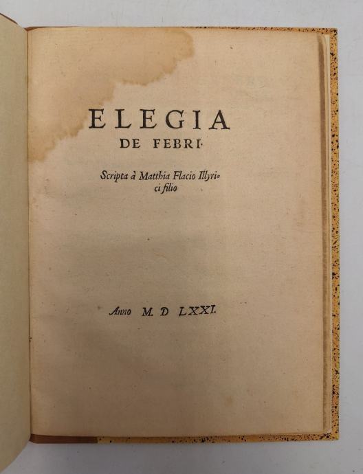 Matija Vlačić - mlađi: Elegia de febri Rijedak primjerak prve njegove tiskane knjige.Prvo i jedino izdanje.Jedna od prvih knjiga medicinske tematike hrvatskog autora.Koliko je nama poznato ovo je prvi poznati primjerak knjige u Hrvatskoj.Matija VLAČIĆ ILIRIK MLAĐI (Matthias Flacius Illyricus iunior), filozof, liječnik (Braunschweig, 12. IX. 1547–Rostock, 27. IV. 1593). Godine 1562. započeo je studij filozofije i medicine u Straßburgu. Studij medicine nastavio je u Tübingenu. U Rostocku je 1574. g. postao magistar filozofije, a te iste godine, također u Rostocku, upisan je kao student medicine. Godine 1581. je postao doctor medicinae. Bio je profesor filozofije, a od 1592. praktične medicine na Sveučilištu u Rostocku. Autor je više medicinsko-filozofskih dijela.Stranica: 13Dimenzije: 15x20Jezik: -Pismo: LatinicaStanje: OdličnoUvez: TvrdiGodina: 1571