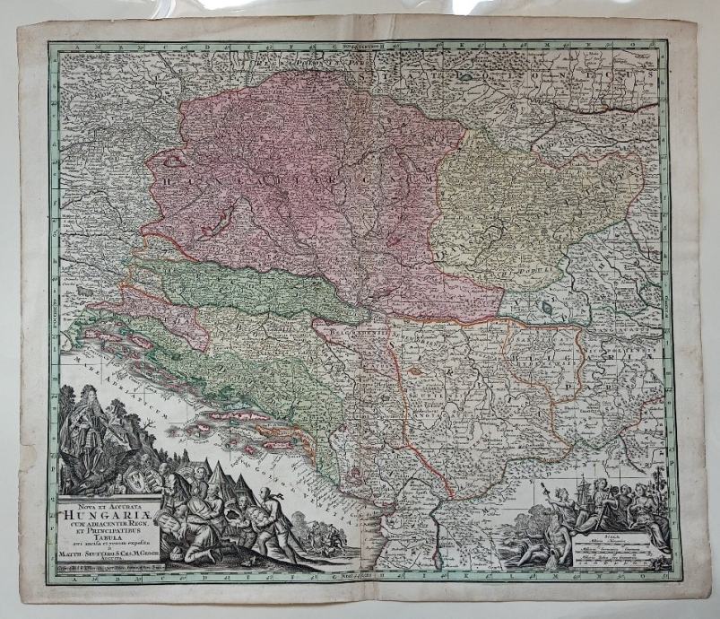 Georg Matthaeus Seutter: Nova et accurata Hungariae, cum adicentib. regn. ...Georg Matthaus Seutter (1678-1757) njemački kartograf, geograf i izdavač karata. Učenik je Johanna Baptista Homanna, a kasnije glavni konkurent Homannovih nasljednika. Kao grafičar počeo je raditi u Augsburgu. Seutter je svoje karte uglavnom gravirao sam, dok su mu karte dekorirali drugi umjetnici koji su često i potpisani uz rub dekoracija. U Seutterovoj radionici nastalo je oko 500 karata. Iako su mu karte vrlo slične Homannovim, nisu nikad dosegle njegovu umjetničku vrijednost. Najpoznatija djela M. Seuttera su " Atlas Geographicus" iz 1728, "Atlas novus indicibus instructus" izdan u Beču oko 1730.godine, "Grosser Atlas" iz 1734. i "Atlas minor praecipua orbis terrarum imperia" iz 1744. godine. Dimenzije: 57x49.5Jezik: AugsburgPismo: LatinicaStanje: Vrlo dobroGodina: 1736
