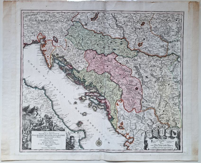 Georg Matthaus Seutter: Nova et Accurata Tabula Regnorum et Provinciarum Dalmatiae, Croatiae, Sclavoniae, Bosniae, Serviae, Istriae et Republicae Ragusanae, cum finitimis regionibus Studio et Impensis Matthaei Seutteri Sacrae Caesareae et Regacrae Catholicae Maisestatis geographi edita Augustae VindelicorumZemljovid Dalmacije, Hrvatske, Slavonije, Srbije i IstreZemljovid prikazuje Slavoniju i Hrvatsku u njihovim srednjovjekovnim granicama te Dalmaciju unutar čijih granica je u skladu s mletačkim predlošcima ucrtana čitava Hercegovina i dio Crne Gore. Na području Slavonije označene su srednjovjekovne županije i teritoriji pojedinih gradova.U donjem desnom uglu nalaze se grbovi Dalmacije, Hrvatske, Slavonije, Bosne (Rame) i Srbije. Naslov zemljovida nalazi se u donjem lijevom uglu u jednostavnom pravokutniku koji okružuju vojni simboli i alegorijski likovi. Mjerilo karte izraženo je u njemačkim (Milliaria Germanica) i ugarskim miljama (Milliaria Hungarica)Georg Matthaus Seutter (1678-1757) njemački kartograf, geograf i izdavač karata. Učenik je Johanna Baptista Homanna, a kasnije glavni konkurent Homannovih nasljednika. Kao grafičar počeo je raditi u Augsburgu. Seutter je svoje karte uglavnom gravirao sam, dok su mu karte dekorirali drugi umjetnici koji su često i potpisani uz rub dekoracija. U Seutterovoj radionici nastalo je oko 500 karata. Iako su mu karte vrlo slične Homannovim, nisu nikad dosegle njegovu umjetničku vrijednost. Najpoznatija djela M. Seuttera su " Atlas Geographicus" iz 1728, "Atlas novus indicibus instructus" izdan u Beču oko 1730.godine, "Grosser Atlas" iz 1734. i "Atlas minor praecipua orbis terrarum imperia" iz 1744. godine. Dimenzije: 62.5x52.5Jezik: AugsburgPismo: LatinicaStanje: Vrlo dobroUvez: MekiGodina: 1709