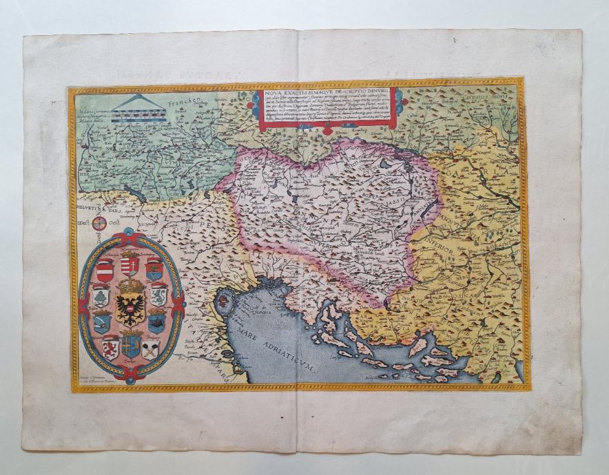Gerard de Jode: Nova exactissimaque descriptio Danubii fluminis permagni totq́ue terrarum orbe celebratissimi… per Christianum Sgrothonuma.tl Geogrph.Rijetki zemljovid toka Dunava autora Gerarda de Jodea, tiskana u Antwerpenu oko 1570. Primjerak iz drugog izdanja De Jodeova atlasa, koji je uredio njegov sin Cornelis, a nazvan je Speculum Orbis Terrae, 1593. Na poleđini je tekst na latinskom i stranica broj 27.Zemljovid prikazuje samo zapadni dio toka Dunava. Prikazano područje nalazi se između izvora Dunava i ušća Drave u njega; uključuje Furlaniju, Sloveniju, Austriju, Hrvatsku, Srbiju i Bosnu.Kartu je nacrtao Christian Sgrooten, a gravirala su je braća Doetecum, čiji se potpis nalazi na zemljovidu dolje lijevo: Ioannes a Deutecu, Lucas a Deutecum fecerunt. Gerard de Jode bio je slavni graver i tiskar, rođen u Nijmegenu 1509. Nakon studija matematike i kozmografije, naučio je umijeće graviranja, neko je vrijeme bio na dvoru Karla V. u Bruxellesu, a zatim se preselio u Antwerpen, gdje je već 1551. počeo tiskati umjetničke gravure Franza Huysa, Martina de Vosa, Cornellea de Corta itd.; ali se ubrzo specijalizirao za graviranje karata i tiskao je u Antwerpenu poznatu kartu svijeta Giacoma Gastaldija, 1568. Italije od istog autora, zatim druge karte mnogih autora, uključujući Talijane, 1564. veliku kartu svijeta Abrahama Orteliusa (Nova totius Terrarum Orbis iuxta neotericorum traditionem descriptio) i konačno 1578. cjeloviti atlas s naslovom Speculum Orbis Terrarum, u 65 ploča, od različitih autora, već djelomično objavljen zasebno. To je jedan od najranijih modernih atlasa (prethodio mu je samo Orteliusov Theatrum), što je danas izuzetno rijetko. U posljednjim godinama života čekao je da pripremi karte pojedinačnih kontinenata, velikih dimenzija, koje je možda kasnije, poput velike karte svijeta, objavio njegov sin Cornelius.Bakropis, fino ručno obojen, u savršenom stanju.Stranica: 1Dimenzije: 60.5x46Jezik: AntwerpenPismo: LatinicaStanje: OdličnoUvez: MekiGodina: 1570