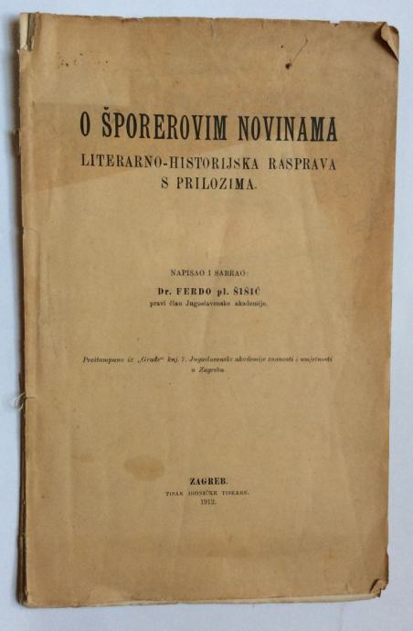 FERDO ŠIŠIĆ, O ŠPOREROVIM NOVINAMA, SEPARAT, ZAGREB, 1912