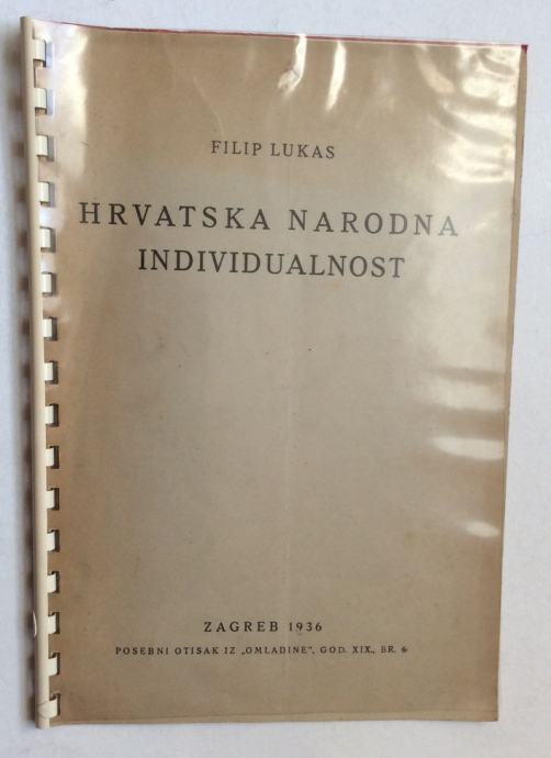 FILIP LUKAS, HRVATSKA NARODNA INDIVIDUALNOST, SEPARAT, ZAGREB, 1936