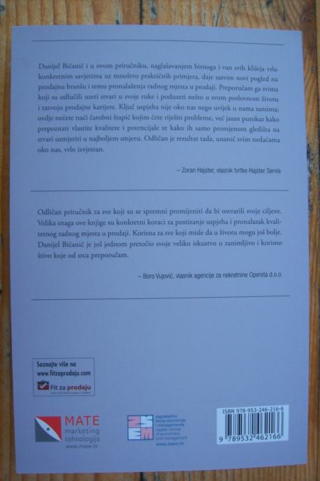 Danijel Bićanić i u ovom priručniku, naglašavanjem bitnoga i van svih klišeja vrlo konkretnim savjetima uz mnoštvo praktičnih primjera, daje sasvim novi pogled na prodajnu branšu i temu pronalaženja radnog mjesta u prodaji. Preporučam ga svima koji su odlučili uzeti stvari u svoje ruke i poduzeti nešto u svom poslovnom životu i razvoju prodajne karijere. Ključ uspjeha nije oko nas nego uvijek u nama samima; ovdje nećete naći čarobni štapić kojim ćete riješiti probleme, već jasan putokaz kako prepoznati vlastite kvalitete i potencijale te kako ih samo promjenom gledišta na stvari usmjeriti u najboljem smjeru. Odličan je rezultat tada, unatoč svim nedaćama oko nas, vrlo izvjestan.