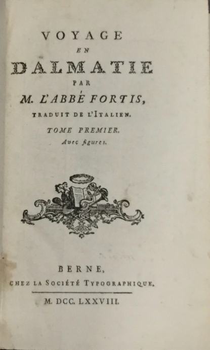 Fortis, Alberto: VOYAGE EN DALMATIAE I-II /PUT PO DALMACIJI I-II Berne 1778. Znameniti talijanski prirodoslovac,putopisac i etnograf (Padova 1741- Bologna 1803) Fortisovo djelo jedno je od prvih i najvažnijih putopisa po Dalmaciji. Detaljan opis Zadra, Šibenika, Splita, Trogira, Makarske, otoka i Dalmatinske zagore sa čak 16 originalnih karata i gravura. Predmetni putopis sastoji se od dva toma, vrlo dobro uščuvana. Prvi dio ima 248 str. a drugi 276 str 13 tabli.