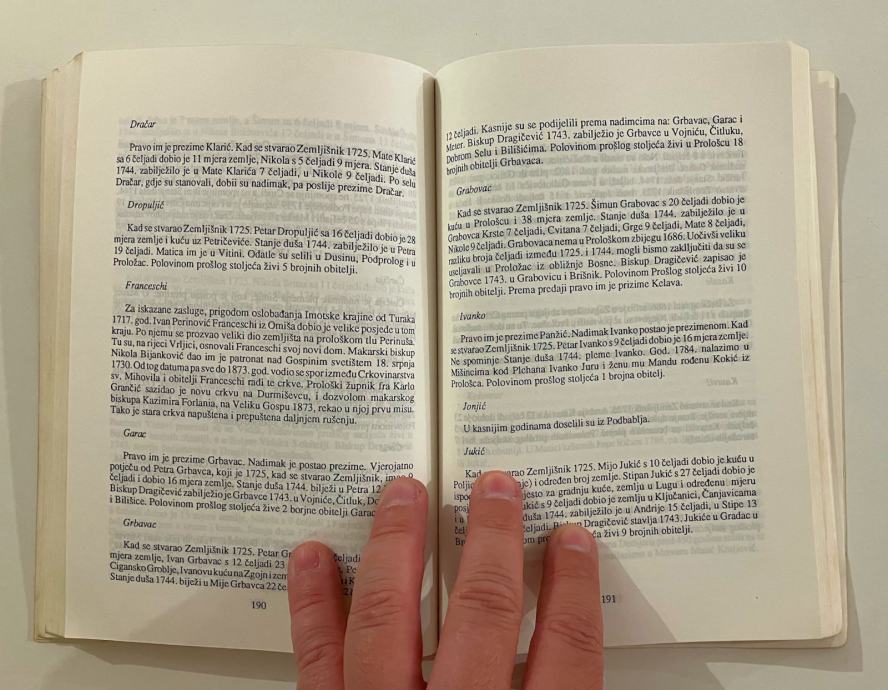 Rad fra Vjekine knjige zasniva se na starim dokumentima koji se nalaze u Zadarskom arhivu. Tu su pohranjeni popisi zbjegova iz Imotske krajine, koji su se zbili 1686. god. kada se selilo ispod Zadvarja i uz rijeku Cetinu. Popis je obavio Talijan na talijanskom jeziku i bilo je teško odgonetnuti pojedina prezimena. Koncem 1725. god. proglašen je novi zemljišnik za većinu imotskih sela. Radilo se na tome i kasnijih godina. Zaključilo se 1747. god. kada je po banderijama podijeljen barovni dio Imotskog polja. U tom zemljišniku zapisan je domaćin svake obitelji i označena svaka čestica zemlje koja mu je dodijeljena. Taj je zemljišnik vrlo važan za upoznavanje stanovništva „nove Imotske krajine“.