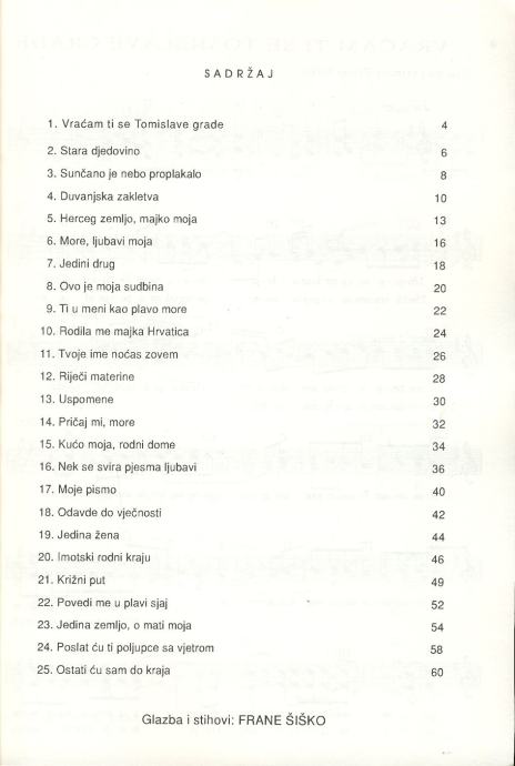 Notni zapisi domoljubnih pjesama. Franjo Šiško rođen je 3. ožujka 1949. u zaseoku Šiškama sela Vinice i istoimene župe. Živi i radi u Splitu, a povremeno dođe u rodni zavičaj koji nosi u svome srcu i o kojemu je iskazao svu svoju ljubav u svojim domoljubnim pjesmama, što ostaje kao trajno svjedočenje ljubavi prema rodnome kraju, ne samo za njega nego još više za sve njegove potomke i sve one koji vole pjesmu kao univerzalni jezik i iskaz. Kao pjesnik kolektiva on je to posebno izrekao i za sebe i za sve koji su se odselili iz Tomislavgrada svojom pjesmom s naslovom: Vraćam ti se, Tomislave Grade. Franjo je do sada objelodanio ove stihozbirke: Moj život i ja (1987.), Molitva za kralja Tomislava (1990.), Stara Djedovino (1992.), Ruže bijele (2003.), zatim dva CD-a Vraćam ti se, Tomislave Grade i Sveti Duje moj, te više audiokaseta, a tiskao je i notnu zbirku uglazbljenih stihova s naslovom Vraćam ti se, Tomislave Grade (1993.). Uvrstili su ga kritičari i priređivači u poetsku antologiju (cvjetovi poezije) autora Mladena Vukovića s naslovom Svetog Duje anđeli koja je objavljena u Splitu 2002. god. i u antologiju Vjekoslava Bobana s naslovom Hercegovina koja je tiskana u Zagrebu 2002. god. Za svoj rad i poetski uradak dobio je i mnoga priznanja, od kojih spominjemo Medaljon kralja Tomislava i nagradu Tomislavgrada, spomenicu Domovinskoga rata prvoga hrvatskog predsjednika dr. Franje Tuđmana koji je s narodom stvorio državu Republiku Hrvatsku. Za najbolju pjesmu o hrvatskom iseljeništvu Kućo moja dobio je 1989. god. nagradu Hrvatske bratske zajednice iz Amerike.