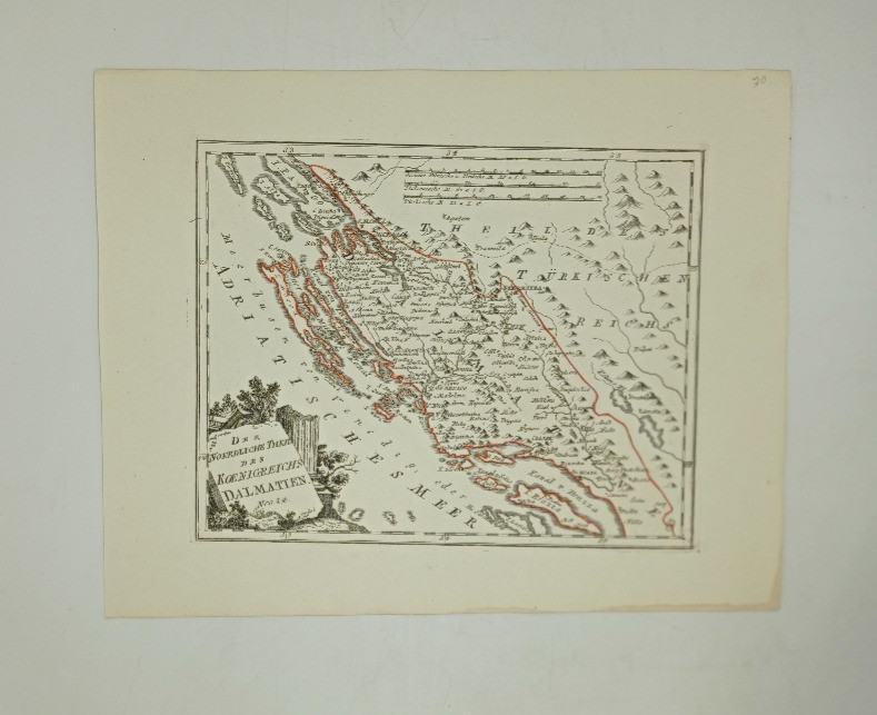 Franz Johann Joseph von Reilly: Der Noerdliche Theil des Koenigreichs Dalmatien / Zemljovid sjeverne Dalmacije Franz Johann Joseph von Reilly (1766.-1820.), bečki trgovac, nakladnik i priređivač karata. Njegovo najpoznatije djelo ja Schauplatz der Welt Atlas (1789-1791) u kojem je veći broj karataa hrvatskih zemalja. Tiskan je u Beču u grafičkoj radionici Ignaza Albrechta. Njegove tri karte Dalmacije čuaju se u državnom arhivu u Zadru. Karta sjevernog dijela Kraljevine Dalmacije obuhvaća područje od polovice otoka Paga ma sjeverozapadu, do kraja otoka Brača, odnosno makarskog područja na kopnu, na jugoistoku. Na karti južnog dijela Kraljevine Dalmacije prikazano je područje od otoka Hvara na sjeverozapadu do područja južno od Budve na jugoistoku. Na trećoj karti prikazano je područje Dalmacije i dio Bosne i Hercegovine. Karta sjeverne Dalmacije čuva se i u sveučilišnoj knjižnici u Splitu. Ostala važnija djela su Deutscher Atlas (1796) i Atlas Univ. (1799) Dimenzije: 28.5x22.5Jezik: Wien-BečGodina: 1790