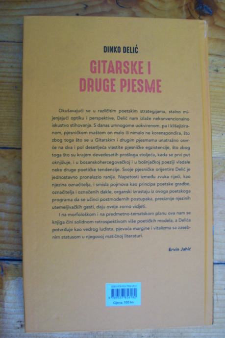 Izabrani stihovi Dinka Delića predstavljeni kao – Gitarske i druge pjesme – organizirani su u tri ciklusa prema tematskom kriteriju. Motivi (auto)referencijalnog karaktera prema pitanjima literature, kritike, autorstva i tekstualnosti imenovani su kao Divlje ovce u nelektoriranoj šumi, dok slike i skice rata za nezavisnost BiH i života u kriminalu i korupciji postdaytonskog doba sačinjavaju Casino “Bosna”. Ispovjedna i ljubavna poezija u ciklusu Prva truba, Cat Woman & PTSD završavaju ovu knjigu. Svaka od osamdeset i jedne pjesme već je objavljena u prve tri Delićeve knjige i u književnim časopisima. Tako da ovo izdanje jeste pokušaj drugačijeg čitanja teksta koji je u pređašnjem vremenskom i literarnom kontekstu imao razliku (la différance) prepoznavanja i drugi interpretativni fokus. Zato su ovo “druge” pjesme. Neke među njima su “gitarske” jer uza se imaju melodiju i aranžman.