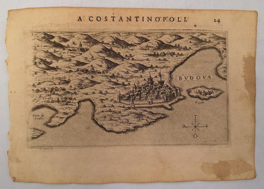 Giuseppe Rosaccio: Veduta BudveGiuseppe Rosaccio (cca 1530-1620) talijanski kozmograf koji je djelovao u Veneciji. Najpoznatija djela su mu “Teatro del Cielo e Terra Florence” iz 1594. godine, izdanje Ptolemejovog “Mode elementa” iz 1604. i “Teatro del Cielo” iz 1615. godine. Za hrvatske zemlje najznačajniji je njegov izolar “Viaggio da Venetia a Constantinopoli” s prikazima svih većih otoka i luka na putu od Venecije do Konstantinopola koje je od 1597. nadalje doživjelo nekoliko izdanja.Ova Rosacciova veduta objavljena je u prvom izdanju Rosacciovog putopisnog djela “Viaggio da Venetia a Constantinopoli per Mare, e per Terra, & insieme quello di Terra Santa“ iz 1598. godine.Dimenzije: 21x14.5Godina: 1598
