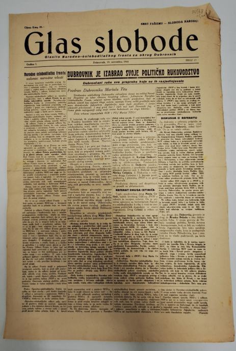 Glas slobode br. 17/1944.Glasilo Narodno - oslobodilačkog fronta za okrug Dubrovnik Stranica: 4Dimenzije: 31.5x47.5Jezik: DubrovnikPismo: LatinicaStanje: DobroUvez: MekiGodina: 1944