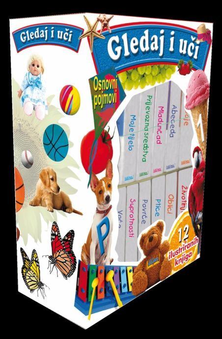 12 ilustriranih knjiga s tvrdim koricama.Debele stranice koje potiču osjet dodira.Praktična kutija za čuvanje knjiga.Zaobljene stranice za sigurno i lako rukovanje.Knjige u kutiji:1. Abeceda2. Brojevi3. Voće4. Povrće5. Životinje6. Oblici7. Mladunčad8. Suprotnosti9. Prijevozna sredstva10. Boje11. Moje tijelo12. Ptice