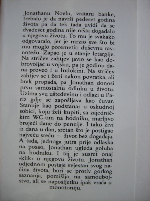 Jonathanu Noelu, vrataru banke, trebalo je da navrši 50 godina života pa da tek tada shvati da se dvadeset godina nije ništa događalo u njegovom životu. To mu je odgovaralo, jer je mrzio sve što bi mu moglo poremetiti duševnu ravnotežu? A tada jednog jutra prije odlaska na posao, Jonathan ugleda goluba na hodniku. I taj je susret onaj "klik" u njegovom životu nakon kojeg on postaje svjestan svog načina života i bori se protiv te gorke spoznaje?