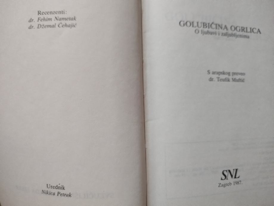 Ibn Hazm bio je od onih pjesnika čija je lirika utjecala na tzv trubadursko ljubavno pjesništvo u južnoj Europi. Njegovo poimanje ljubavi zasniva se na muškarčevu doživljaju žene kao superiornog bića. Gospa je vitezu u pravilu nedostižna, daleka i uzvišena. Zbirku je s arapskog jezika preveo dr. Teufik Muftić. SNL, Zagreb 1987.