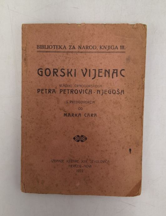 Petar Petrović Njegoš: Gorski vijenac Vladike CrnogorskogaS predgovorom od Marka Cara.Stranica: 144Dimenzije: 11.5x16Jezik: Herceg NoviPismo: LatinicaStanje: Vrlo dobroUvez: MekiGodina: 1922