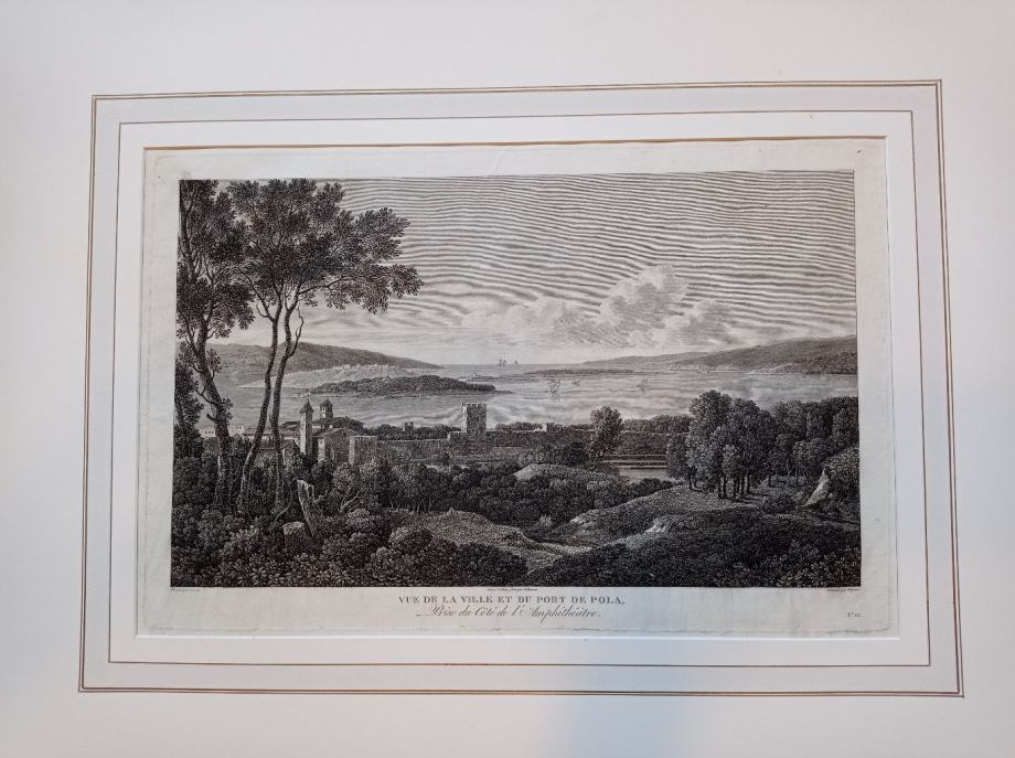 Louis-Francois Cassas i Joseph Lavallée: Grad i luka Pule, gledano sa strane kazališta ili borilišta/Vue de la ville et du port de PolaPrise du Cote de l'amphitheatreVeduta iz monumentalnog djela „Voyage pittoresque dell'Istrie et de la Dalmatie“, Pariz, 1802.Bakrorez, šire margineDimenzije bakroreza: 44,5x30Ukupne dimenzije: 70x50Dimenzije: 44,5x30Jezik: ParizPismo: LatinicaStanje: Vrlo dobroGodina: 1802