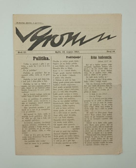 Grom br. 14/1921.Šaljivi listOdgovorni urednik: Marko UvodićStranica: 10Dimenzije: 24x32Jezik: SplitPismo: LatinicaStanje: DobroUvez: MekiGodina: 1921