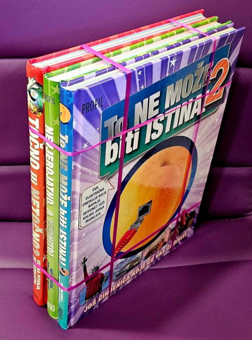 To ne može biti istina 2Koliko stabala ima na svijetu?Koliko bi dugo trajao pad do središta Zemlje?Koliko otpada ima u svemiru?Koliko su velika usta vodenkonja?Koliko dugo životinje mogu zadržati dah pod vodom?Nakon izuzetno popularnih knjiga To ne može biti istina i Točno ili netočno stiže nam i treći nastavak u ovoj izuzetnoj seriji.Naš je planet nevjerojatno mjesto, a ova će nam knjiga otkriti prekrasne, zanimljive i očaravajuće detalje. Jednostavno pitanje u naslovu na koje pokušavamo pogoditi odgovor zaintrigirat će nam maštu, a objašnjenje u tekstu pamtljivim činjenicama pojasnit će nam zašto je baš tako i kako je do toga došlo. Primjerice, znate li koliko je Mjesec udaljen od Zemlje? Ponekad Mjesec izgleda tako blizu, ali između Zemlje i Mjeseca stali bi svi planeti Sunčeva sustava. Zanimljivo, zar ne? Dobit ćemo odgovore na pitanja o malim i velikim životinjama, o opasnim grabežljivcima ili smrtonosnim meduzama, o fino ugođenom mehanizmu našeg tijela, o fascinantnim građevinama koje su ljudi podigli, o čudima svemira.Ova knjiga neočekivanim usporedbama podataka otkriva raznolikost i bogatstvo našeg svijeta.Podijeljena je u tri velike cjeline: Planet Zemlja i okolo njega, Svijet prirode i Svijet ljudi, a svako od ovih poglavlja pruža nam izvanredne podatke, očaravajuće činjenice i velika dostignuća.Nevjerojatno, a istinito!Knjiga Nevjerojatno, a istinito! prikazuje čudesne prirodne fenomene, biljni i životinjski svijet te neobične građevine pa otkriva pozadinu priče – zašto sve izgleda upravo tako i kako su se priroda i ljudi prilagodili okruženju. Neka od pitanja i fenomena na koja ova prekrasna knjiga daje odgovore i nudi objašnjenja jesu: zašto Kapadokija sliči na vilinsko kraljevstvo, kako je nastao ledenjak Slonovo stopalo na Grenlandu, zašto u depresiji Danakil u Etiopiji izvire sumpor, a baš su ondje pronađeni najstariji ostaci hominida nazvanog Lucy, kako je nastala kamena šuma na Madagaskaru i mnoga druga. Znate li da je svaki kip u Vojsci od terakote koju čini gotovo 8000 vojnika isklesanih prije 2200 godina jedinstven? Znate li da su u Indiji ljudi izgradili mostove s pomoću korijenja i lijana drva banjan? Jeste li čuli da je smola stabla zmajeve krvi crvena? Moglo bi vas uplašiti, ali dlačne su grinje velike samo 0,3 mm i žive na našim trepavicama – i prilično su korisne. Jeste li kad vidjeli leptira koji na krilima ima brojeve 88 ili 89?Naš je planet potpuno očaravajući i još uvijek otkrivamo prekrasne detalje o biljnom i životinjskom svijetu u zraku, na zemlji i u vodi, a saznat ćemo i priče o nastanku čudesnih građevina. Čitajući ovu sjajnu knjigu, otkrit ćemo kako u prirodi uvijek postoji dobar razlog za ono što nam se na prvi pogled čini posve nevjerojatnim.Točno ili netočno?Nekoć se vjerovalo da mozak raste i razvija se samo u djetinjstvu i pubertetu. Sada se zna da se ljudski mozak stalno mijenja na različite načine, uključujući zamjenu nekih oštećenih stanica.Kad bi svi neuroni u ljudskome tijelu bili postavljeni jedan do drugoga, došli bi do mjeseca. Nojeva očna jabučica veća je od njegova mozga. Nakon izuzetno uspješne knjige To ne može biti istina, evo i jednako upečatljivog nastavka. Podijeljena na poglavlja o ljudskom tijelu, prirodi, znanosti i tehnologiji, svemiru, Zemlji te povijesti i kulturi ova će knjiga zadiviti svakog nevjerojatnim podacima, pitanjima i začuđujućim odgovorima. Upotrebljavamo li samo 10% svo mozga, hoćete li se zaista ohladiti popijete li vrući čaj, narastu li astronauti u svemiru, može li doista žohar živjeti bez glave tri dana, može li voda zakipjeti na vrhu planine, koliko ima planeta u galaksiji Mliječni put, postoji li više zvijezda na nebu ili zrnaca pijeska na Zemlji, kako znamo da su neandertalci uživali u glazbi reći će vam ova nevjerojatna knjiga. U njoj također možete doznati da postoje tri vrste suza, da slonovi nikad ne zaboravljaju, da maline pripadaju porodici ruža, da zvuk putuje oko četiri puta brže vodom nego zrakom, da je otvarač za konzerve otkriven 50 godina nakon prve konzerve, da je temperatura u Zemljinoj jezgri 5600 °C, da Mount Everest naraste 1 cm svake godine i još mnogo mnogo toga. Zabavna, puna nevjerojatnih i zanimljivih podata iz svijeta oko nas, oduševit će male i velike čitatelje.Stranica: 192+192+192Dimenzije: 22 x 28.5Jezik: ZagrebPismo: LatinicaStanje: Nova knjigaUvez: TvrdiGodina: 2018