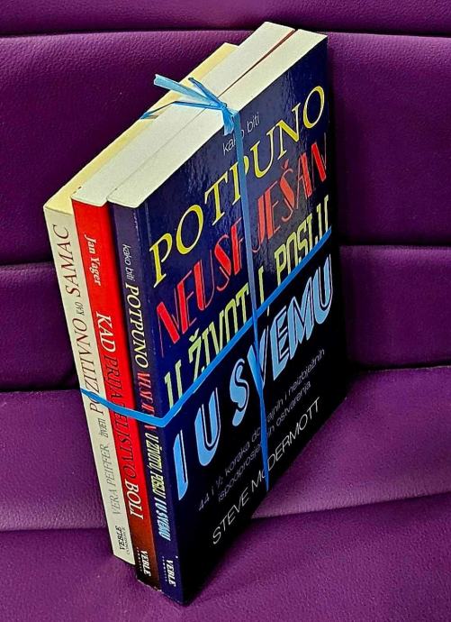 ŽIVJETI POZITIVNO KAO SAMACU današnje doba sve veći broj ljudi žive kao samci. Praktični i razumni savjeti Vere Peiffer pomoći će vam da uživate u vlastitom društvu i iskoristite prednosti koje vam pruža status pozitivnog samca. Jeste li doista sretni kao samac? Osjećate li se osamljeno? Povezujete li svoj samački život s bolnim razmišljanjem kako ćete provesti blagdane ili godišnji odmor? Naučite kako upoznati nove prijatelje, kako proširiti svoje društvene horizonte, kako razviti pozitivan vlastiti imidž.KAD PRIJATELJSTVO BOLICilj knjige “Kada prijateljstvo boli” jest da približiti vam pomagala za prepoznavanje, i izlaženje na kraj s destruktivnim i štetnim prijateljstvima. Čitajući ovu knjigu dobit ćete bolji uvid u to zbog čega u prijateljstva, poglavito vaša ili vama bliskih osoba, pukla ili su trebala završiti, te kako se nositi s tim okončanjima. Nadalje, ako imate naviku stvaranja negativnih prijateljstava, knjiga će vam pomoći u odabiru pozitivnih i zdravih prijatelja koji će vam obogatiti život i pomoći vam da brže uspijete i napredujete u karijeri.POTPUNO NEUSPJEŠAN U ŽIVOTU,POSLU I U SVEMU Knjiga Kako biti potpuno neuspješan vrhunski je protuživotni priručnik. Od nepostojanja ikakvih ciljeva, ne preuzimanja osobne odgovornosti za svoj život, svaka ideja, strategija, sugestija i priča zajamčeno će vas gurnuti u sporu prometnu traku potpune nedoraslosti. Poznat po zanimljivom podsmješljivom stilu, Steve McDermott vas vodi kroz četrdeset četiri i pol praktična koraka da vam pokaže kako možete biti posebno neuspješni, te naučiti kako da nikad ne budete kreativni ili inovativni, nikad ne uspostavljate lijepe veze i odnose, da se nikad dobro ne nasmijete, da prestanete raditi da biste zarađivali za život, te da nikad ne promijenite svoja vjerovanja.Stranica: 180+228+200Dimenzije: 15x21cmJezik: ZagrebPismo: LatinicaStanje: Nova knjigaUvez: MekiGodina: 2001