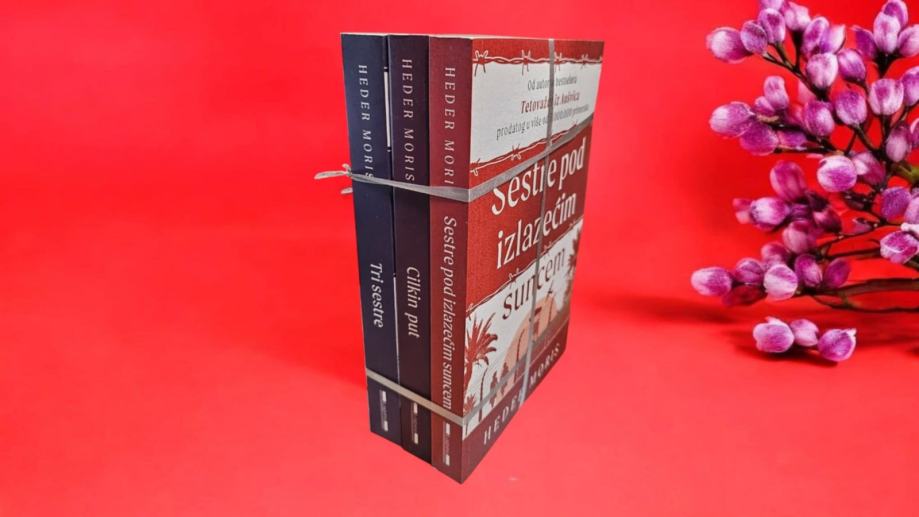 Sestre pod izlazećim suncemOd autorke bestselera „Tetovažer iz Aušvica“ Heder Moris, prodatog u preko 5.000.000 primeraka, stiže roman „Sestre pod izlazećim suncem“ koji je inspirisan istinitom pričom o ženama u ratu, o njihovom sestrinstvu, hrabrosti i izdržljivosti u najmračnijem okolnostima. Godine 1942. Singapur pada u ruke japanske vojske. Očajnički želeći da spase dete, engleska muzičarka Nora Čejmbers šalje u Australiju svoju osmogodišnju ćerku Sali jednim od poslednjih civilnh brodova koji napuštaju Singapur. Ona ostaje u okupiranom gradu sa mužem i ostarelim roditeljima, strepeći da možda nikada više neće videti svoje dete. Dok malajsko poluostrvo gori, australijska medicinska sestra Nesta Džejms pridružuje se tovaru prestravljenih ljudi koji se evakuišu potrpani na britanski vojni brod „Viner Bruk“. Među njima je i Nora. Nakon samo dva dana plovidbe brod je bombardovan i potopljen. Nesta i Nora uspevaju da se dokopaju obale negde u Indoneziji, ali su uhvaćene i sprovedene u jedan od najozloglašenijih japanskih zarobljeničkih logora u kojem se umire od gladi i fizičke brutalnosti nad zarobljenicima. Ali čak i na takvom mestu može se naći tračak nade. Nora je oformila „orkestar glasova“, u pokušaju da internirane makar na trenutak izbavi iz bede snagom muzike. Prijateljstva koja će tako nastati među desetinama žena daće im snagu potrebnu da prežive. Heder Moris rođena je na Novom Zelandu, a živi u Australiji. Nekoliko godina, dok je radila u velikoj državnoj bolnici u Melburnu, studirala je i pisala scenarija. Godine 2003. upoznala starijeg gospodina „čiju priču vredi čuti“. Dan kad je upoznala Lalija Sokolova promenio je i njen i njegov život. Njegovu priču napisala je kao scenario, a zatim ju je preoblikovala u svoj prvi roman „Tetovažer iz Aušvica“.Tri sestreOd autorke bestselera Tetovažer iz Aušvica i Cilkin putCIBI. MAGDA. LIVIJA.Njihova priča slomiće vam srce.Njihovo putovanje ispuniće vas nadom.Njihova imena biće upamćena.Roman o porodici, hrabrosti i izdržljivosti zasnovan na istinitoj pričibdquo;Želim da obećate meni i jedna drugoj da ćete se uvek brinuti o svojim sestrama. Da ćete uvek biti podrška jedna drugoj bez obzira na sve. Da nećete dozvoliti da vas išta razdvoji. Da li razumete?ldquo;Cibi, Magda i Livija kao devojčice daju obećanje svom ocu ndash; da će ostati jedna uz drugu ma šta da se dogodi. Godinama kasnije, petnaestogodišnja Livija po naređenju nacista odlazi u Aušvic. Devetnaestogodišnja Cibi seća se date reči i sledi Liviju, odlučna da zaštiti sestru ili umre s njom. Zajedno se bore za opstanak, okružene nezamislivom okrutnošću i teškoćama.Sedamnaestogodišnja Magda ostaje sa majkom i dedom. Neko vreme im uspeva da se od nacističke milicije koja im odvodi prijatelje i rođake uspešno kriju kod susede na tavanu ili u šumi, ali na kraju i ona biva uhvaćena i transportovana u logor smrti.U logoru Aušvic-Birkenau tri sestre su ponovo zajedno i, sećajući se svog oca, ponovo se zavetuju, ovog puta jedna drugoj ndash; da će preživeti.Heder Moris, autorka svetskih bestselera Tetovažer iz Aušvica i Cilkin put, donosi zapanjujuću novu priču koja će vam slomiti srce, ali i zadiviti hrabrošću i silinom ljubavi tri sestre, koje je međusobno obećanje održalo u životu.Cilkin putOd autorke bestselera Tetovažer iz AušvicaZasnovano na potresnoj istinitoj priči o ljubavi i opstankuLepota ju je spasla ndash; i osudila.Cilka je imala svega šesnaest godina kad je 1942. odvedena u koncentracioni logor Aušvic-Birkenau, gde je komandant odmah primetio njenu lepotu. Zbog toga će biti prisilno odvojena od ostalih zatvorenica, i ubrzo shvatiti da moć, čak i nerado prihvaćena, znači opstanak.Završetak rata i oslobađanje logora Cilki neće doneti slobodu već optužbu za kolaboraciju jer je spavala s neprijateljem i osudu na zatočeništvo u sibirskom logoru. Ali da li je zaista imala izbora? I gde su granice morala za Cilku, koja je odvedena u Aušvic kad je još bila dete?U Sibiru se Cilka suočava i sa novim i sa starim, jezivim izazovima uključujući i neželjenu pažnju stražara. Ali kad upozna ljubaznu lekarku, Cilka dospeva pod njeno okrilje i počinje da neguje bolesne logoraše trudeći se da im pomogne u surovim uslovima.Svakodnevno se suočavajući sa smrću i užasom, Cilka u sebi otkriva snagu kakvu nije ni znala da poseduje. A kad počne da s oklevanjem gradi veze i odnose u toj surovoj novoj stvarnosti, Cilka shvata da, uprkos svemu što joj se dogodilo, u njenom srcu ima mesta za ljubav.Od deteta do žene, od žene do isceliteljke, Cilkin put rasvetljava izdržljivost ljudskog duha i našu volju da preživimo.bdquo;Nikad nisam sreo hrabriju osobu od Cilke.ldquo; Lali Sokolov, tetovažer iz Aušvicabdquo;Cilkina neizmerna hrabrost i odlučnost da preživi čak i kad je svaka nada već izgubljena bude veliko poštovanje. Potresna priča koju ćete dugo pamtiti.ldquo; Sunday Expressbdquo;Izuzetna priča o snazi da se prevaziđu nezamislive teškoće.Stranica: 336+384+344Dimenzije: 13x20 cmJezik: BEOGRADPismo: LatinicaStanje: Nova knjigaUvez: MekiGodina: 2024