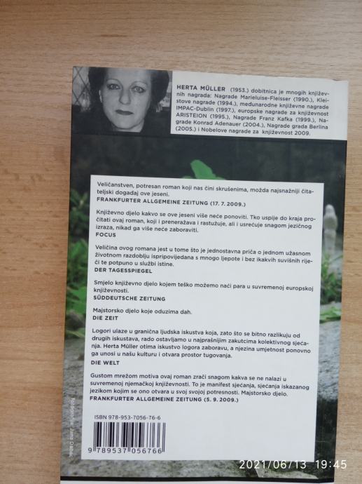 Herta Muller: Ljuljačka daha, roman o životu u ukrajinskom logoru 1945. godine. Autorica je dobitnica Nobelove nagrade za književnost 2009.