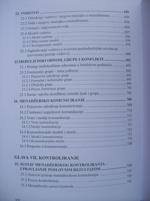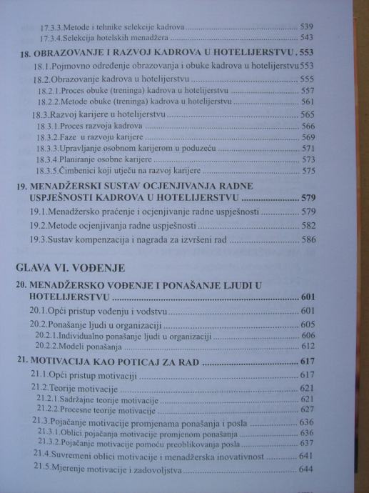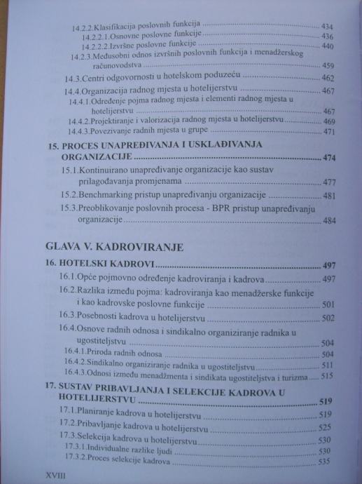 OPĆE ODREĐENJE MENADŽMENTA/ Definicija menadžmenta i menadžera/ Funkcije menadžmenta/ RAZVOJ ZNANOSTI O MENADŽMENTU/ Prapočeci pristupa menadžmentu/ Konvecionalni pristup menadžmentu/ Nekonvencionalni pristup menadžmentu/ Suvremeni pristup menadžmentu/ HOTELIJERSTVO I UGOSTITELJSTVO/ Ugostiteljstvo kao gospodarska djelatnost/ Hotelijerstvo kao gospodarska grana/ Posebnost menadžmenta i menadžment u hotelijerstvu (…)/ PODUZETNIČKI MENADŽMENT U HOTELSKOM PODUZEĆU/ Pojmovno odreženje i obilježja hotelskog poduzeća/ Poduzetnišvo u hotelijerstvu/ Poduzetnički menadžment u hotelijerstvu/ (…)/ STANDARDI U HOTELIJERSTVU/ Opće određenje pojma standardizacija/ Hotelski lanci/ ISO standardi i njihova primjena u hotelijerstvu/ ETIKA I UGLED HOTELSKOG MENADŽMENTA/ Pojmovno određenje etike i morala/ Poslovna etika i društvena odgovornost/ Etičke i moralne vrijednosti menadžmenta i poslovni bonton u hotelijerstvu/ PLANIRANJE KAO FUNKCIJA HOTELSKOG MENADŽMENTA/ VIZIJA, MISIJA I CILJEVI U HOTELSKOM PODUZEĆU/ MENADŽERSKO PREDVIĐANJE/ STRATEŠKI MENADŽMENT, STRATEGIJE I STRATEŠKO PLANIRANJE U HOTELSKOM PODUZEĆU/ MENADŽERSKE ODLUKE I SUSTAV ODLUČIVANJA U HOTELIJERSTVU/ SUSTAV ORGANIZIRANJA/ ORGANIZACIJSKA STRUKTURA HOTELSKOG PODUZEĆA/ ORGANIZACIJA POSLOVNIH I PROCESNIH FUNKCIJA U HOTELSKOM PODUZEĆU/ PROCES UNAPREĐENJA I USKLAĐIVANJA ORGANIZACIJE/ HOTELSKI KADROVI/ SUSTAV PRIBAVLJANJA I SELEKCIJE KADROVA U HOTELIJERSTVU/ OBRAZOVANJE I RAZVOJ KADROVA U HOTELIJERSTVU/ MENADŽERSKI SUSTAV OCJENJIVANJA RADNE USPJEŠNOSTI KADROVA U HOTELIJERSTVU/ MENADŽERSKO VOĐENJE I PONAŠANJE LJUDI U HOTELIJERSTVU/ MOTIVACIJA KAO POTICAJ ZA RAD/ VODSTVO/ MEĐULJUDSKI ODNOSI, GRUPE I KONFLIKTI/ MENADŽERSKO KOMUNICIRANJE/ SUSTAV MENADŽERSKOG KONTROLIRANJE, UPRAVLJANJE POSLOVNIM REZULTATOM/ METODE I TEHNIKE MENADŽERSKE KONTROLE/ MENADŽERSKI INFORMACIJSKI SUSTAVI ZA PODRŠKU KONTROLIRANJA, MENADŽMENT INFORMATION SYSTEM