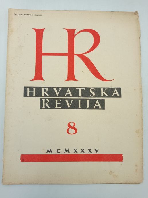 Hrvatska revija br. 8/1935Stranica: 55Dimenzije: 22x28Jezik: ZagrebPismo: LatinicaStanje: DobroUvez: MekiGodina: 1935