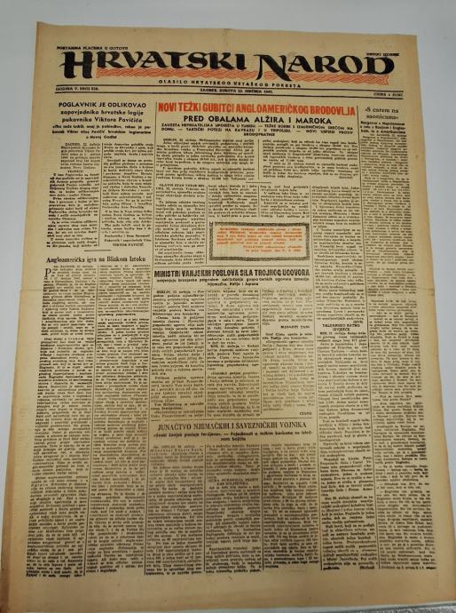 Hrvatski narod - glasilo hrvatskog ustaškog pokreta br. 638/1943.Hrvatski narod je bio hrvatski tjednik iz Zagreba. Uskoro nakon početka izlaženja postao je dnevnim listom. Glavni urednik mu je bio Mile Budak, a politički urednik je bio Ivan Oršanić. Ravnatelj je bio Marko Čović. Među ostalima, članke su pisali Marko Čović, Ivo Bogdan, Matija Kovačić, Stipe Ćorlukić i drugi. List je postao okosnicom ustaške domovinske organizacije u vrijeme dok su ustaše bili zabranjena organizacija u Jugoslaviji i dok se većina pokreta nalazila u emigraciji. Uspostavom NDH, Hrvatski narod postaje stožernim listom. Stranica: 8Dimenzije: 41x56Jezik: ZagrebPismo: LatinicaStanje: Vrlo dobroUvez: MekiGodina: 1943