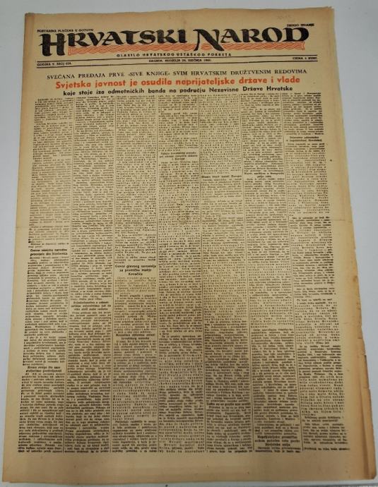 Hrvatski narod - glasilo hrvatskog ustaškog pokreta br. 639/1943.Hrvatski narod je bio hrvatski tjednik iz Zagreba. Uskoro nakon početka izlaženja postao je dnevnim listom. Glavni urednik mu je bio Mile Budak, a politički urednik je bio Ivan Oršanić. Ravnatelj je bio Marko Čović. Među ostalima, članke su pisali Marko Čović, Ivo Bogdan, Matija Kovačić, Stipe Ćorlukić i drugi. List je postao okosnicom ustaške domovinske organizacije u vrijeme dok su ustaše bili zabranjena organizacija u Jugoslaviji i dok se većina pokreta nalazila u emigraciji. Uspostavom NDH, Hrvatski narod postaje stožernim listom. Stranica: 8Dimenzije: 41x56Jezik: ZagrebPismo: LatinicaStanje: Vrlo dobroUvez: MekiGodina: 1943