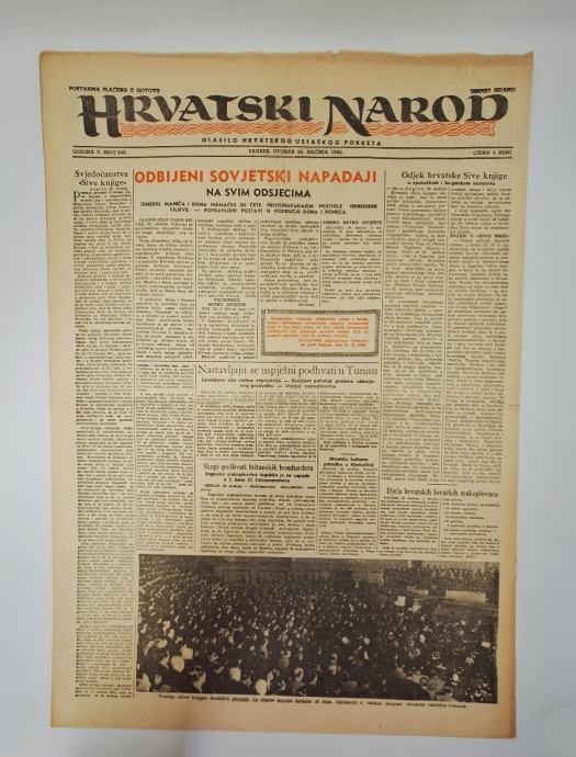 Hrvatski narod - glasilo hrvatskog ustaškog pokreta br. 640/1943.Glavni i odgovorni urednik: Danijel UvanovićStranica: 8Dimenzije: 40x56.5Jezik: ZagrebPismo: LatinicaStanje: DobroUvez: MekiGodina: 1943