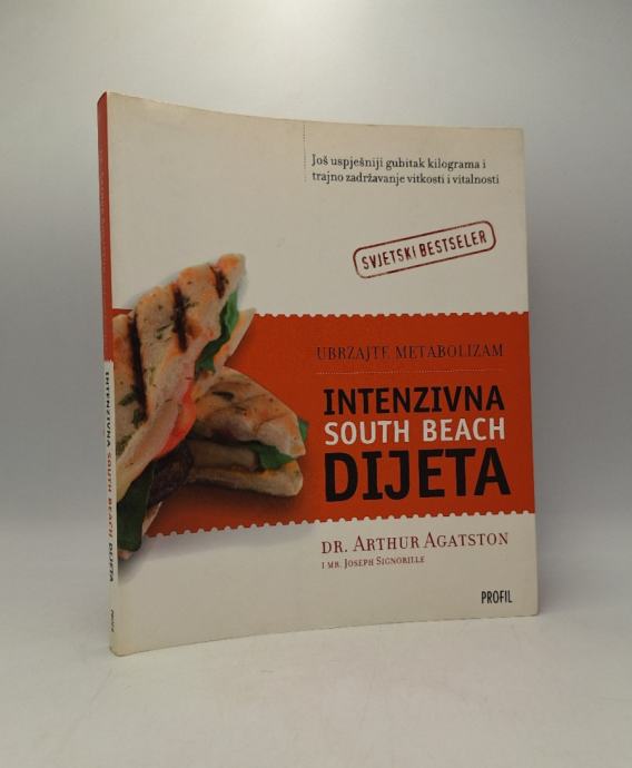 Dr. Arthur Agatston: Intenzivna South Beach dijetaSvjetski bestseler poznatog američkog kardiologa i autora dr. Arthura Agatstona i mr. Josepha Signorille. Nastavak je na knjige “South Beach dijeta” (2003.) i “Kuharica South Beach dijete” (2005.) te donosi savjete za još uspješniji gubitak kilograma i trajno zadržavanje vitkosti i vitalnosti.Otkako se pojavila 2003. godine “South beach dijeta” promijenila je američki način prehrane. Prodana je u više od 8,7 milijuna primjeraka, te bila bestseler 90 dana prema listi New York Timesa. South Beach dijeta omogućuje zasitne obroke, barem dva dnevna međuobroka, a povremeno i desert, što potpuno otklanja osjećaj gladi.Intenzivni South beach program omogućuje još bolje rezultate dijete, ubrzavanje metabolizma i prevladavanje frustracije zbog platoa u gubljenju kilograma. Kao što su se uvjerili milijuni širom svijeta, South Beach dijeta više je od dijete. To je zdraviji i sretniji način života.Stranica: 311Dimenzije: 20x24Jezik: ZagrebPismo: LatinicaStanje: Vrlo dobroUvez: MekiGodina: 2009