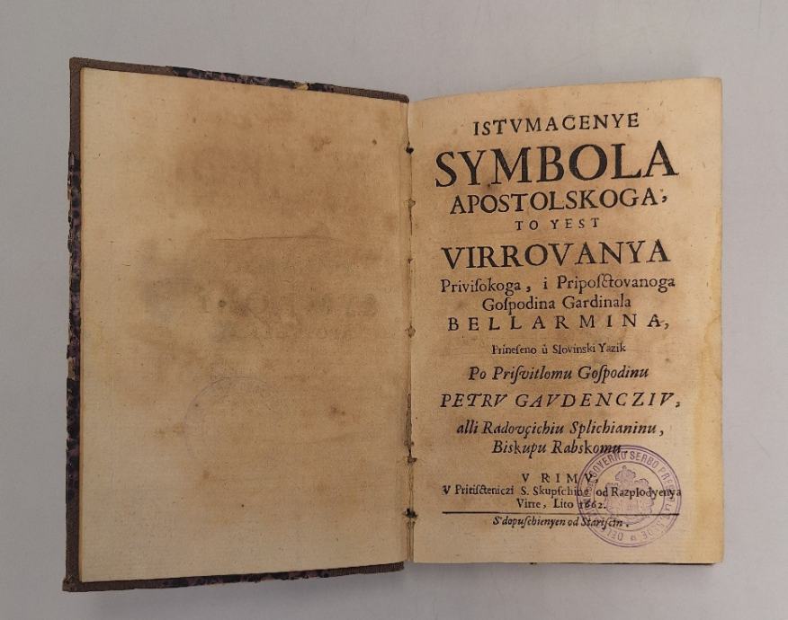 Roberto Bellarmino, Istumačenje Simbola Apostolskoga, to jest Virovanja G. Gardinala Bellarmina, U Rimu, U Pritištenici S.Skupšćine od rasplodjenja vire, Lito 1662. Po Petru Gaudenciju ali Radovčiću Splićaninu.knjiga ima žig od poslasntva Kraljevine Jugoslavije pri VatikanuRoberto Bellarmino (Montepulciano, 1542. - Rim, 1621.), crkveni naučitelj, isusovac, autor katekizma koji je za cijelu Katoličku crkvu nakon Tridentskoga koncila odobrio papa Klement VIII. Poznat je po tome što je sudjelovao u reformi kalendara, sudjelovao je i u ispravljanju prvog službenog izdanja Biblije nakon Tridentskoga koncila, procjenjivao je i postavke Giordana Bruna, pokušao pomiriti Galileja s Katoličkom crkvom. Za Hrvate je posebno znamenit jer je primio ispovjest vjere prvog unijatskoga episkopa u Hrvatskoj Simeona Vratanje. Njegov Katekizam napisan latinskim kao Doctrina Christiana preveden je na brojne jezike pa i na hrvatski. Istomačenje Simbola Apostolskoga (Exspositio Symboli Apostolici), tj. tumačenje Vjerovanja na hrvatski je preveo Petar Radovčić koji se potpisivao i kao Pietro Guadenzio, odnosno Petrus Gaudentius (Split, 1572. - Rab, 1664.). Bio je splitski kanonik, bratim u Sv. Jeronimu u Rimu. Papa Urban VIII. imenovao ga je biskupom Raba. Brinuo se za vjersko prosvjećivanje svojih vjernika te je preveo još jednu Bellarminovu knjigu, pripravu za dobru smrt - Nauk za dobro umriti...istomačen u dalmatinski jezik (1658.). Njegov prijevod velikoga Bellarminova Katekizma doživio je i drugi izdanje (1709.). Spominje ga i Jerolim Kavanjin u svom djelu Bogatstvo i uboštvo.GAUDENCIJE, Petar (Petrus Gaudentius, Pietro Gaudenzi, Petar Radovčić), biskup (Split, 1572 — Rab, 1664). Školovao se u Splitu. God. 1602. spominje se kao splitski kanonik i bratim u gostinjcu sv. Jeronima u Rimu. God. 1607. pred kardinalskim zborom u Rimu uspješno je branio prava splitskoga Kaptola protiv nadbiskupovih presezanja. Papa Urban VIII. imenovao ga je u ožujku 1636. biskupom u Rabu. God. 1637–59. održao je u svojoj biskupiji četiri sinode. Od 1654. brojnim je molbama tražio od Kongregacije za širenje vjere izdavanje nužno potrebnih teoloških djela na hrvatskom jeziku. Tako je oko 1658 (Š. Ljubić navodi 1653) u tiskari Kongregacije tiskan Način za dobro umriti otca Iv. Jezusa Maria iztomačen u dalmatinski jezik. Djelo je pretiskano 1657. i 1709. U pojedinim dokumentima navodi se da je to prijevod Bellarminova djela De arte bene moriendi, a u drugima da je riječ o prijevodu Arte di benmorire kojemu je autor bosonogi karmelićanin Giovanni Gesù Maria. Preveo je na hrvatski jezik veliki Bellarminov katekizam Expositio Symboli Apostolici Roberti Cardinalis Bellarmini pod naslovom Iztumačenje Simbola Apostolskoga, to jest virovanja g. kard. Bellarmina (objelodanjen u tiskari Kongregacije u Rimu 1662. i 1709). Š. Ljubić i C. Sommervogel drže da je preveo i drugo Bellarminovo djelo, De ascensione mentis in Deum – Od uzvišenja duše Bogu, zatim Societas et Communio Spiritualis R. P. Dominici de Jesu Maria, u prijevodu Družtvo duhovno otca Domenika (Rim 1662, tiskano u tiskari Kongregacije) te Način bogoljubni služiti sv. Misu. J. Burić navodi i djelo prevedeno pod naslovom Ushodište za uzajti na poznanje Gospodina Boga. Pjesnik J. Kavanjin posvetio mu je nekoliko stihova. Stranica: 238Dimenzije: 12.5x17.5Jezik: ItalijaPismo: LatinicaStanje: Vrlo dobroUvez: MekiGodina: 1662