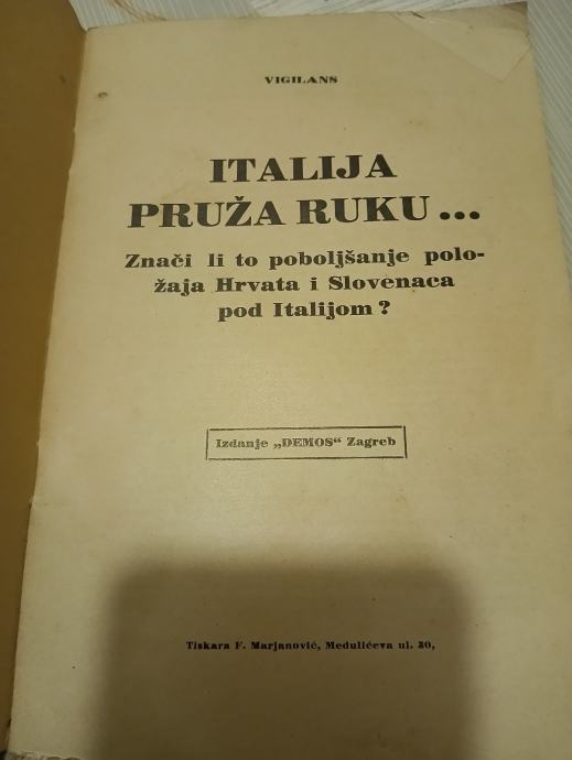 Prodajem knjižicu na 32 stranice, Italija pruža ruku, znači li to poboljšanje položaja Hrvata i Slovenaca pod Italijom,izdanje Demos Zagreb. Plačanje na račun ili gotovina.