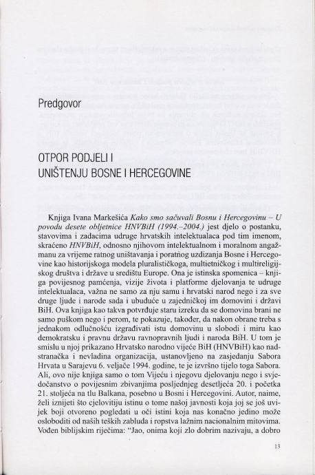 U povodu 10. obljetnice Hrvatskoga narodnog vijeća Bosne i Hercegovine (1994.-2004.) Knjiga govori o postanku, stavovima i zadacima udruge hrvatskih intelektualaca okupljenih oko Hrvatskog narodnog vijeća BiH, odnosno o njihovom intelektualnom i moralnom angažmanu za vrijeme ratnog uništavanja i poratnog uzdizanja Bosne i Hercegovine kao historijskoga modela pluralističkoga, multietničkog i multireligijskog društva i države u središtu Europe.