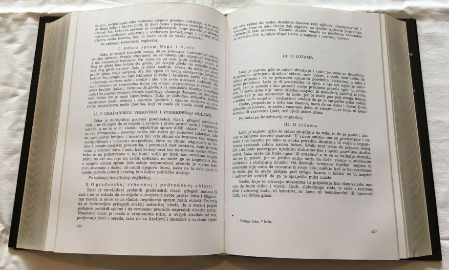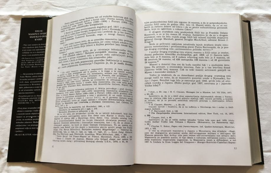 Ovo djelo je pretisak 4. izdanja Masonstva u Hrvata i 1. izdanja Masona u Hrvatskoj. Knjiga je podijeljena u dva dijela. U prvom, nakon kraćeg uvoda te poglavlja o smislu masonstva i kronologiji svjetskog masonstva, slijedi opširno poglavlje u kojem se govori o počecima masonstva u Hrvata, o odnosu masonstva i organizacije Ujedinjenje ili smrti jugoslavenske omladine, o ulogama koje su masoni imali u nekim povijesnim događajima, npr. sarajevskom atentatu, stvaranju Kraljevine SHS, ubojstvu kralja Aleksandra u Marseillesu te prevratu 27. ožujka 1941. u Beogradu. U drugom dijelu knjige obrađeno je masonstvo u Hrvatskoj u razdoblju od 1918. pa do kraja šezdesetih godina. Knjiga završava podacima o rasprostranjenosti masona u svijetu početkom osamdesetih godina.